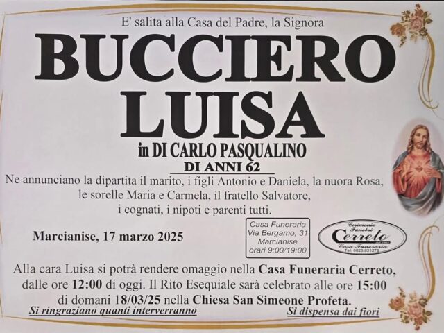 I funerali saranno celebrati domani alle 15 nella chiesa di San Simeone Profeta a Marcianise.
