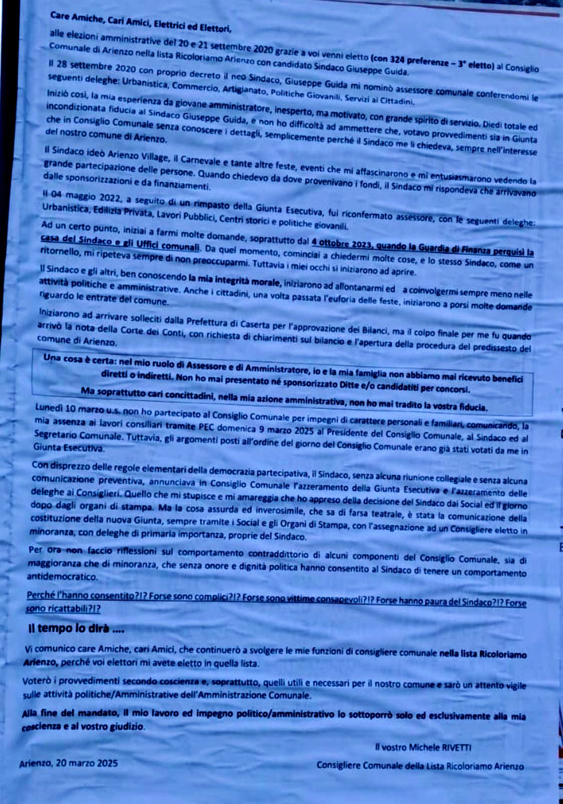 Arienzo. Stamani è stato pubblicato il manifesto formato maxi con cui Michele Rivetti, ex assessore da poco uscito dalla giunta, ha fatto il punto della situazione scagliandosi contro il primo cittadino Peppe Guida dopo essere stato nell’esecutivo per quasi 5 anni, dalla prima giunta eletta nel 2020.
