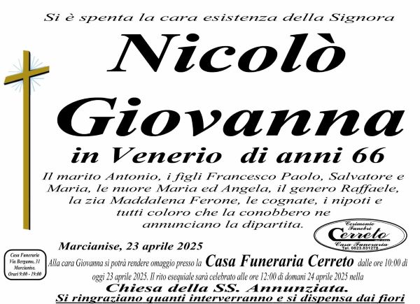Questa mattina dalle ore 10 si potrà rendere omaggio a Giovanna alla camera ardente allestita nella Casa Funeraria Cerreto, mentre i funerali saranno celebrati domani alle ore 12 nella Chiesa della SS. Annunziata.