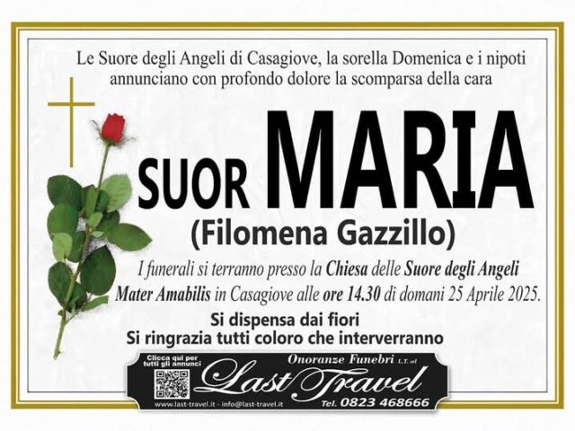 Si è spenta Suor Maria, nata Filomena Gazzillo a Casolla, 85 anni. Ad annunciare la triste notizia le suore degli Angeli di Casagiove di cui lei faceva parte situata in via Trieste.