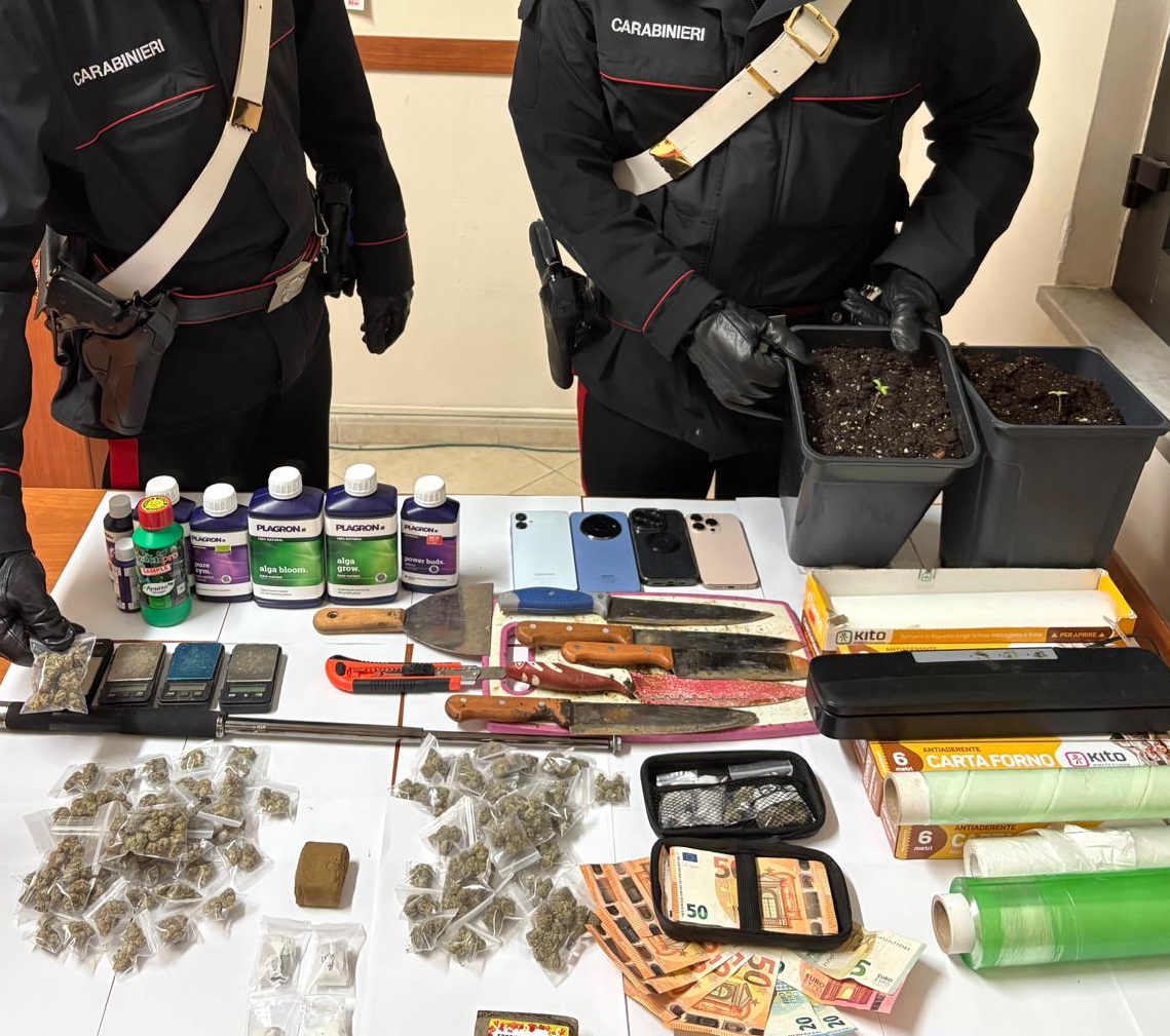 I carabinieri, attraverso la visione dei filmai delle telecamere presenti in loco, sono riusciti a risalire prima alla targa della vettura e poi al conducente. E’ stato quindi eseguito un servizio di osservazione e pedinamento durante il quale il giovane è stato notato recarsi più volte in un centro sportivo in disuso, non di sua proprietà. Bloccato all’uscita del predetto centro sportivo, del quale il giovane deteneva le chiavi del cancello d’ingresso, è stato sottoposto a perquisizione personale e veicolare a seguito della quale i carabinieri hanno rinvenuto, all’interno del veicolo, una pochette contenente due bustine di sostanza stupefacente del tipo hashish del peso di gr. 12.6, due bustine di marijuana del peso complessivo di gr 7,1 uno sfollagente telescopico, 4 telefoni cellulari, nonché la complessiva somma in denaro contante di € 1.355,00.