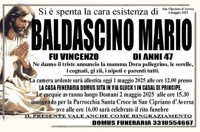 Il rito esequiale sarà celebrato alle ore 16 presso la Parrocchia Santa Croce in San Cipriano d’Aversa.