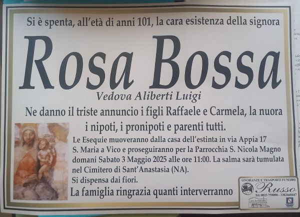 I funerali di nonna Rosa saranno celebrati domani alle ore 11 presso la Parrocchia San Nicola Magno. Una volta conclusasi la cerimonia, la salma sarà trasportata presso il cimitero di Sant’Anastasia a Napoli.