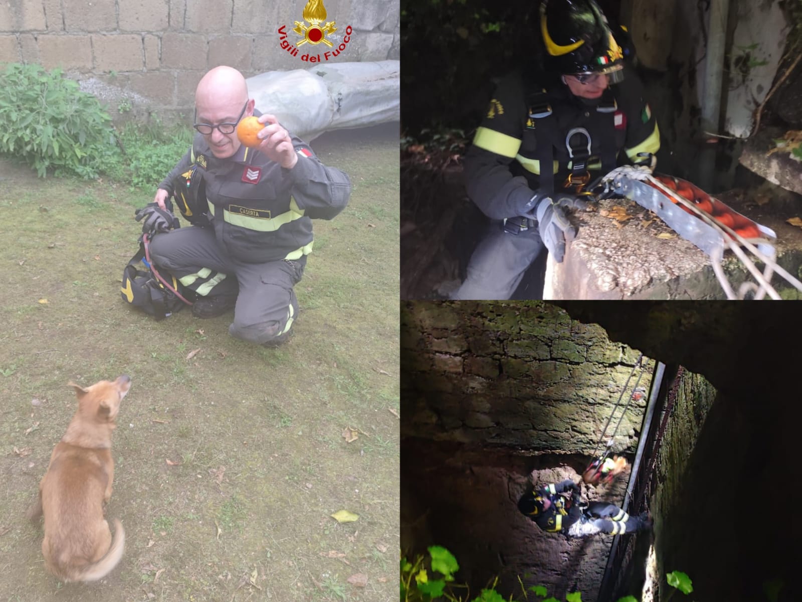 Un operatore del nucleo S.A.F. si è calato all’interno del pozzo, ha imbracato con cura il cane e lo ha riportato in superficie, riconsegnandolo sano e salvo alla famiglia