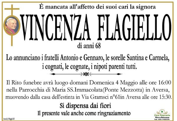I funerali di Vincenza si terranno oggi, a darne il triste annuncio i fratelli Antonio e Gennaro, le sorelle Santina e Carmela e i parenti tutti.