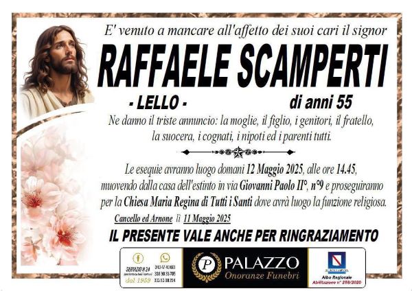 I funerali di Raffaele si terranno domani presso la chiesa Maria Regina di Tutti i Santi alle ore 14:45.