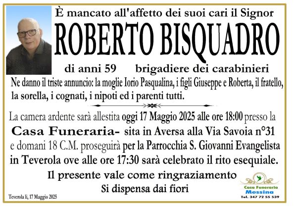 Si chiamava Roberto Bisquadro, aveva 59 anni. Per anni ha servito il corpo dei carabinieri con professionalità e senso del dovere, e oltre a un ottimo carabiniere è stato un ottimo marito e padre, una persona davvero speciale e buona. La comunità si stringe ora alla famiglia per darle conforto.