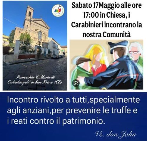 L’incontro si svolgerà presso la Parrocchia “Santa Maria di Costantinopoli”. Tale incontro, rivolto a tutti, in special modo agli anziani, è stato organizzato allo scopo di fornire gli strumenti necessari alle persone per prevenire possibili truffe future.