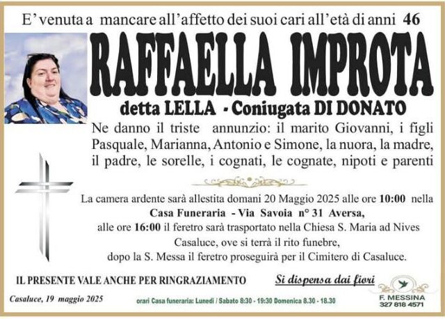I suoi funerali si terranno oggi pomeriggio alle ore 16 presso la Chiesa Santa Maria ad Nives a Casaluce. Una volta celebrato il funerale, il feretro sarà accompagnato presso il cimitero di Casaluce.