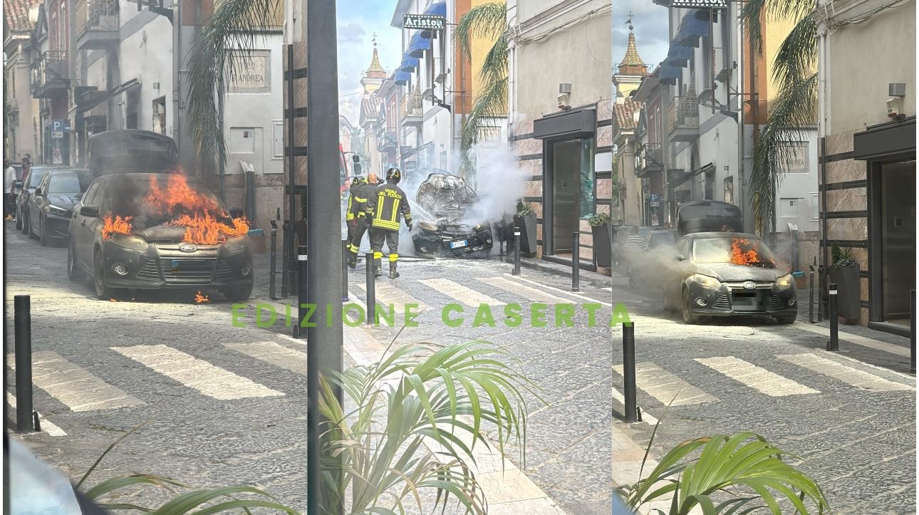MARCIANISE. Attimi di paura nel cuore del centro storico di Marcianise, dove nel pomeriggio di oggi una berlina scura ha preso fuoco improvvisamente mentre transitava tra via Duomo e via Santoro. L’episodio è avvenuto intorno alle 16:30, quando alcuni passanti hanno notato del fumo uscire dal cofano anteriore dell’auto, seguito da alte fiamme che in pochi istanti hanno avvolto il veicolo.