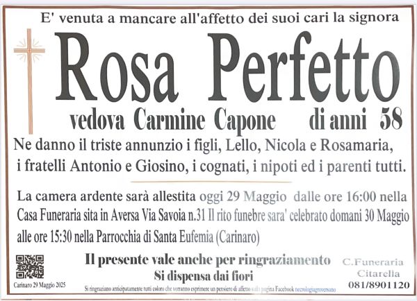 I funerali avranno luogo domani alle ore 15:30 presso la Parrocchia di Santa Eufemia.