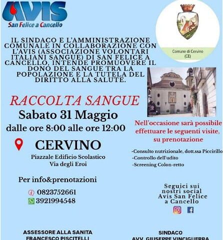 Il giorno 31 maggio ci sarà la raccolta sangue in collaborazione con l’Avis San Felice a Cancello presso il Piazzale dell’edificio scolastico Via degli Eroi dalle ore 08.00 alle ore 12.00. Sempre organizzato dal sindaco Giuseppe Vinciguerra e dall’assessore alla sanità Francesco Piscitelli.