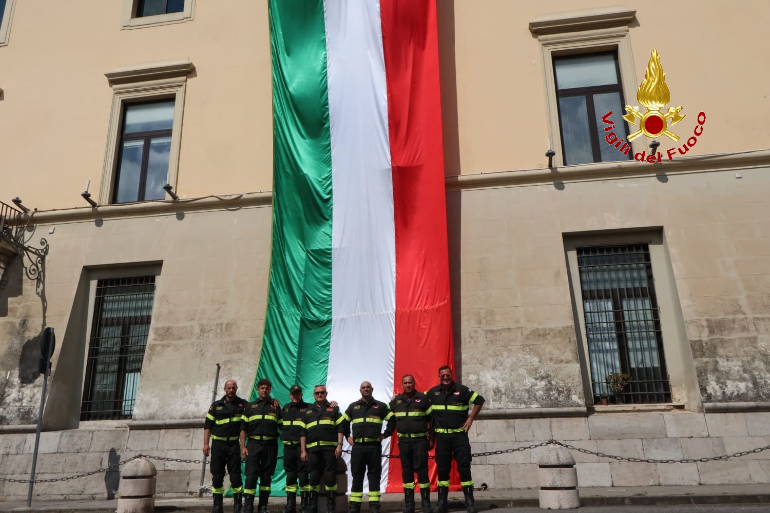 Contemporaneamente, in Piazza Vanvitelli, i Vigili del Fuoco hanno simbolicamente steso il tricolore italiano sull’edificio della Prefettura, rinnovando lo spirito di unità e coesione nazionale.