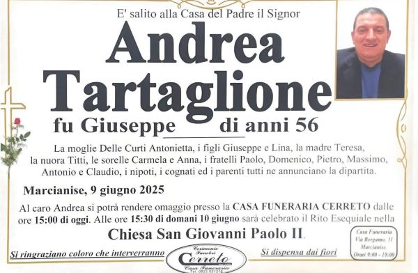 Si chiamava Andrea Tartaglione, aveva 56 anni. Era afflitto da un brutto male e nonostante abbia combattuto con tutto sé stesso e gli sforzi dei medici, alla fine non ce l’ha fatta. Andrea era conosciuto come un uomo buono e gentile, un lavoratore onesto, nonché un ottimo padre e marito, amorevole e sempre disponibile per i suoi cari e per chi aveva bisogno del suo aiuto.