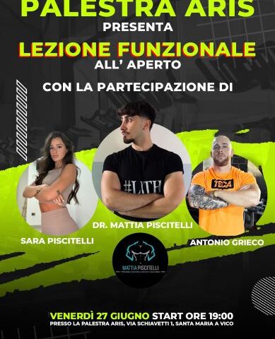 L’evento “Lezione Funzionale all’aperto” si terrà a Santa Maria a Vico venerdì 27 giugno alle ore 19 presso la Palestra Aris situata in via Schiavetti.