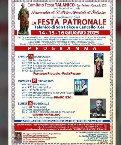 San Felice a Cancello. I giorni 14, 15 e 16 giugno a Talanico, frazione di San Felice a Cancello, ci sarà la “Festa Patronale”, organizzata dal “Comitato Festa Talanico” in collaborazione con la Parrocchia di San Pietro Apostolo.