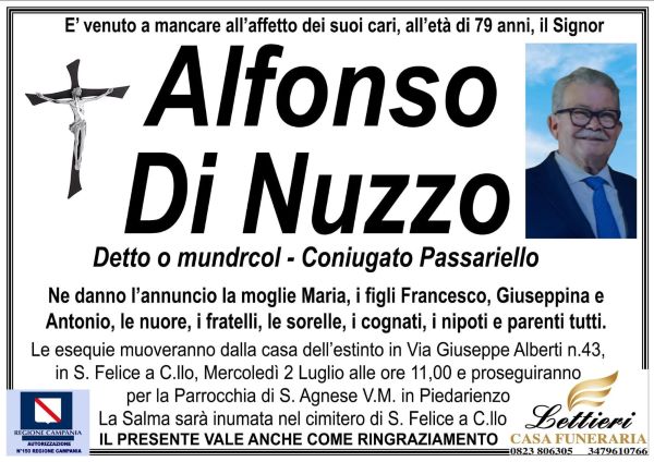 I suoi funerali saranno domani, a darne il triste annuncio, la moglie Maria, i figli Francesco, Giuseppina e Antonio. Il rito esequiale sarà celebrato presso la Parrocchia di S. Agnese V.M. in Piedarienzo alle ore 11. La salma sarà poi portata al cimitero di San Felice a Cancello.