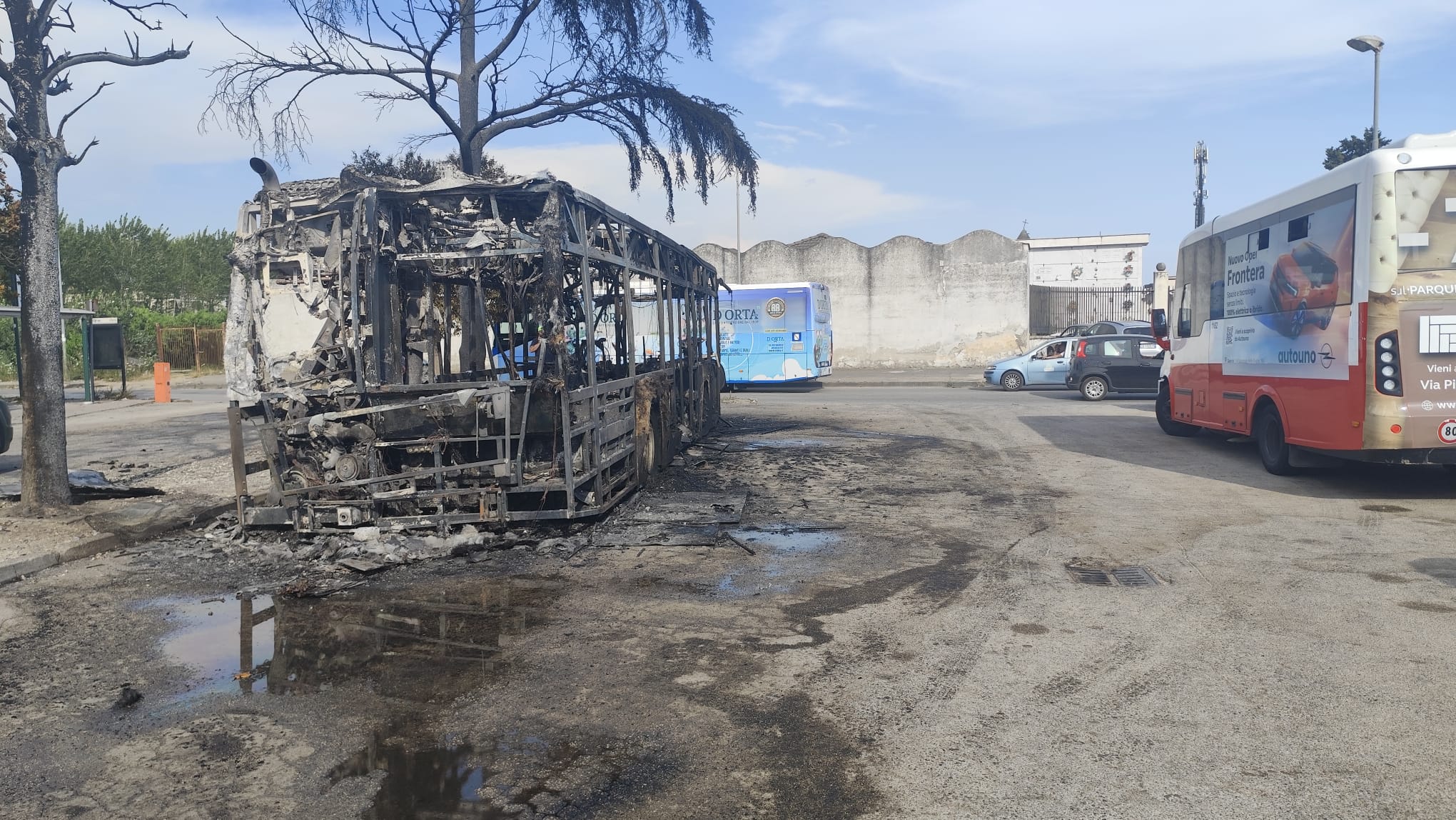ORTA DI ATELLA. È stato finalmente domato l’incendio che questo pomeriggio, poco prima delle 16, ha distrutto un pullman fermo in Via Bugnano, nei pressi del cimitero comunale. Le fiamme, che avevano generato un denso fumo nero visibile anche da Succivo, sono state spente dopo oltre mezz’ora di apprensione e segnalazioni da parte dei residenti.