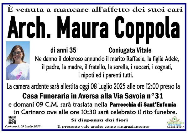 Carinaro. Grande dolore per la comunità di Carinaro a causa della prematura scomparsa di Maura Coppola, una giovane e stimata architetta che purtroppo se ne è andata all’età di 35 anni.
