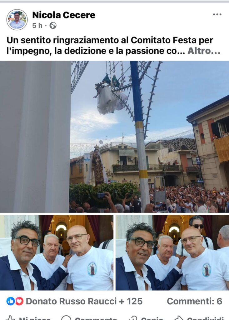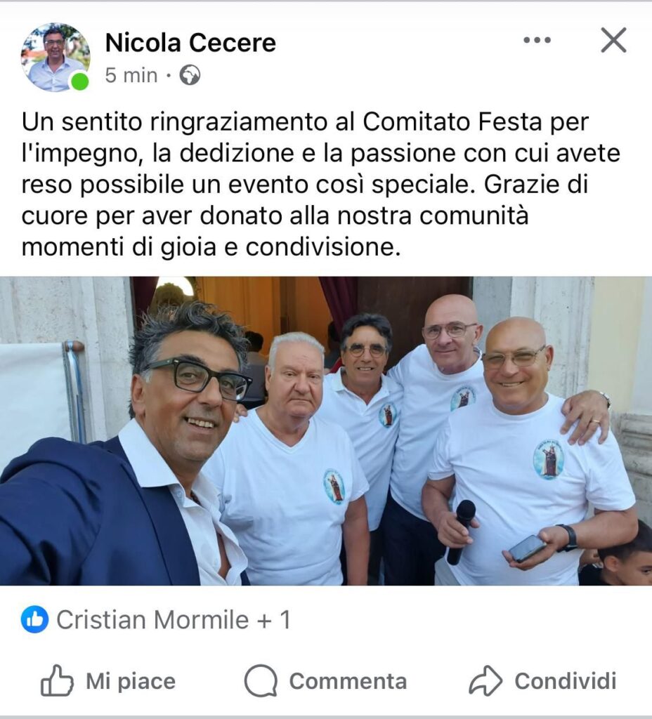Successivamente la processione è partita e lui ha postato sul suo profilo facebook tutte le foto che si era fatto, con in prima linea quella di gruppo con i 4 del comitato festa, ringraziandoli per l’impegno: “Un sentito ringraziamento al Comitato Festa per l’impegno, la dedizione e la passione con cui avete reso possibile un evento così speciale. Grazie di cuore per aver donato alla nostra comunità momenti di gioia e condivisione”. Belle parole…