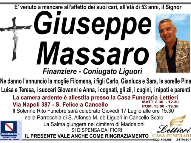 Il caro Giuseppe lascia la moglie Filomena, i figli Carlo, Gianluca e Sara, le dorelle, i suoceri e gli altri parenti.