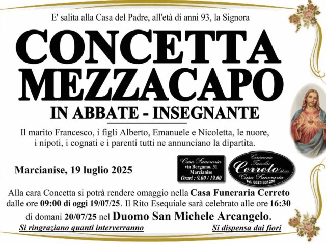 La camera ardente è stata allestita nella Casa Funeraria Cerreto in via Bergamo a Marcianise. L’ultimo saluto sarà celebrato domani, domenica 20 luglio, alle ore 16.30, presso il Duomo di San Michele Arcangelo, dove tutta la comunità potrà stringersi attorno alla famiglia e rendere omaggio a una donna che ha lasciato un’impronta indelebile nel cuore di molti.