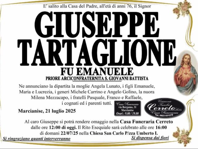 MARCIANISE. Un grave lutto tocca Marcianise. È mancato Giuseppe Tartaglione, per tutti Peppino, autentica istituzione cittadina conosciuto da tutti, aveva 76 anni. Ha vissuto una vita intera in Piazza, sin da bambino aveva ereditato e gestiva una delle prime ferramenta della città in piazza Principe di Napoli proprio dinanzi le Poste.