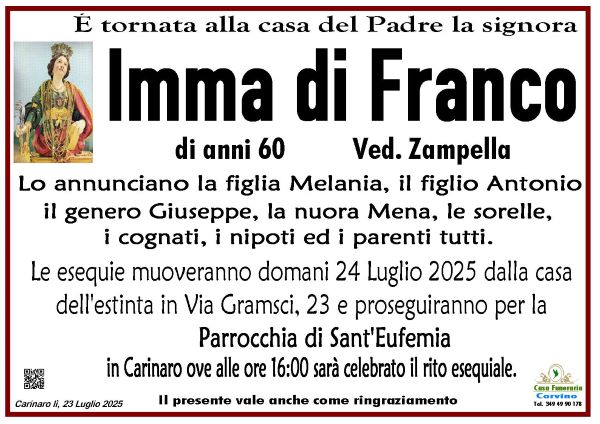 Saputa la triste notizia, la comunità si stringe alla famiglia di Imma, ai suoi figli Melania e Antonio, nonché alle sorelle Pina e Daniela cercando di dare loro conforto in un momento così buio.