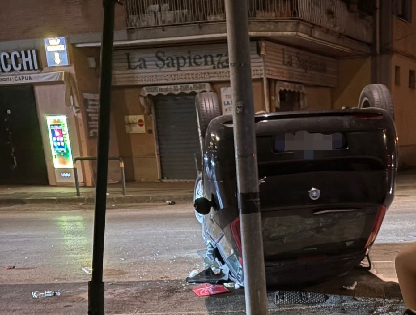 Capua. Dalle immagini si nota la Fiat Punto ribaltata di fronte al tabacchi, poco prima del supermercato. La velocità sostenuta potrebbe essere tra le cause del sinistro. Rilevanti i danni al veicolo.