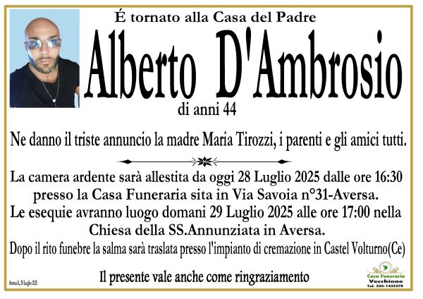 Alberto era conosciuto come un uomo perbene, grande lavoratore, una persona speciale e gentile, molto attaccato alla famiglia. Appassionato del Napoli e amico di tutti. La sua scomparsa lascia un vuoto incolmabile nel cuore di chi ha avuto la fortuna di conoscerlo.