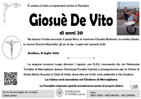 Regionale. Purtroppo, una triste notizia ieri mattina ha scosso profondamente la frazione di Valle di Avellino. Giosuè De Vito, un giovane di soli 20 anni di Valle, è deceduto nei giorni scorsi, ma la notizia ufficiale della sua scomparsa è giunta solo ieri.