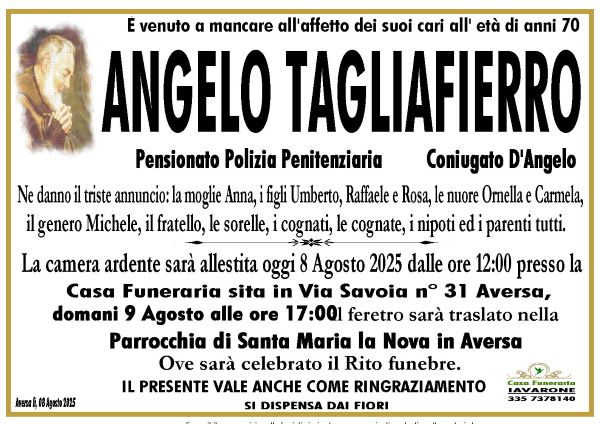 Aversa. Grande dolore per la Polizia penitenziaria e per la comunità di Aversa per la scomparsa di Angelo Tagliaferro, agente della Polizia Penitenziaria in pensione.