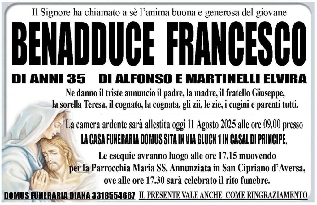 I suoi funerali saranno celebrati oggi alle ore 17:30 presso la Parrocchia Maria SS. Annunziata a San Cipriano d’Aversa.