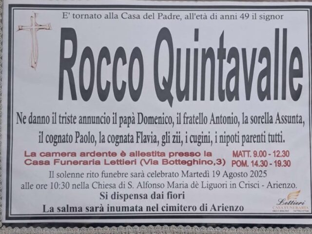 Arienzo. Sono stati fissati i funerali di Rocco Quintavalle, 49enne morto ad Arienzo venerdì pomeriggio. Le esequie si terranno domani alle ore 10:30 presso la Chiesa di Sant’Alfonso Maria dè Liquori in Crisci