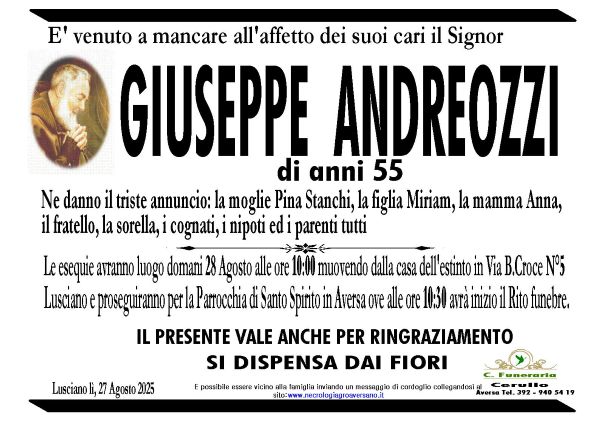 Lusciano. Nelle scorse ore, purtroppo, è venuto a mancare prematuramente un padre di famiglia. Si chiamava Giuseppe Andreozzi, aveva 55 anni. La sua scomparsa, ha scosso la comunità di Lusciano gettando nel dolore e nello sconforto amici e familiari.