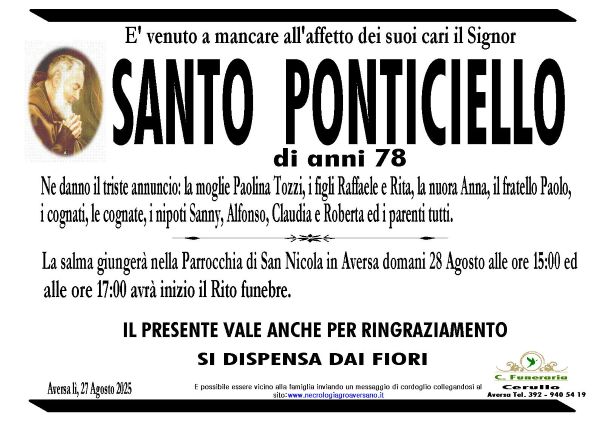 La sua dipartita ha colpito duramente amici e parenti. Lascia la moglie Paolina e i figli Raffaele e Rita. Saputa la triste notizia la comunità locale si è stretta ai familiari per dare loro conforto. I suoi funerali saranno celebrati oggi alle 17 presso la Parrocchia San Nicola. Terminata la cerimonia, la Salma sarà portata al Cimitero di Aversa.