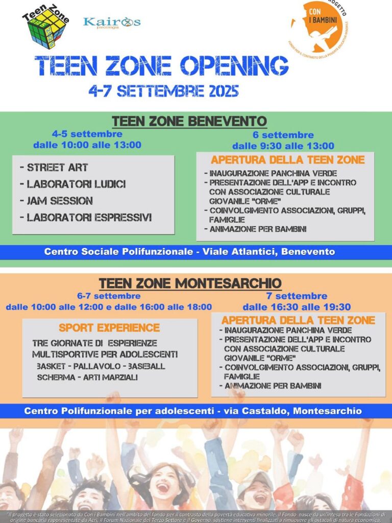 La opening di “Teen Zone” Montesarchio si terrà dal 6 al 7 settembre. il 6 e 7, dalle 10 alle 12, poi dalle 16 alle 18 ci sarà “Sport Experience”, tre giornate di esperienze multisport per adolescenti con basket, pallavolo, baseball, scherma e arti marziali.