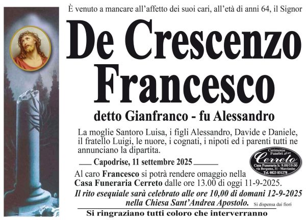 Lascia la moglie Luisa e i figli Alessandro, Davide e Daniele ora in lacrime. I suoi funerali saranno celebrati alle ore 10 di domani presso la Chiesa Sant’Andrea Apostolo.
