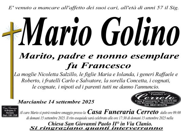 La sua dipartita ha scosso profondamente amici e parenti ora distrutti dall’accaduto. Si chiamava Mario Golino e si è spento all’età di 57 anni. Era conosciuto come una persona buona, gentile, un uomo generoso e sempre pronto ad aiutare. Un ottimo padre, marito e nonno. Un lavoratore onesto, benvoluto da tutti quelli che hanno avuto la fortuna di conoscerlo.