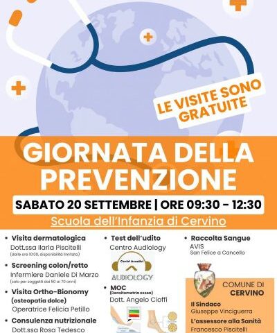 Cervino. Sabato, dalle ore 9:30 alle ore 12:30 presso la scuola dell’infanzia di Cervino, si terrà la “Gionata della Prevenzione”, in cui ci si potrà sottoporre a visite gratuite.