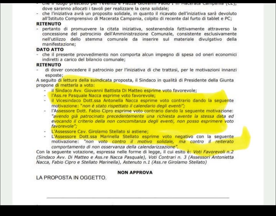 Macerata Campania. Colpo di scena nella seduta di giunta del 15 settembre, la proposta di concessione del patrocinio morale alla “Cena in Bianco Solidale 2025” non è stata approvata: tre assessori hanno espresso voto contrario (Cipro, la vicesindaco Nacca e la Marinella Stellato), mentre un quarto (Girolamo Stellato) si è astenuto. Solo due i voti favorevoli, compreso quello del primo cittadino.