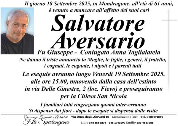 Mondragone. Grande dolore oggi a Mondragone per la prematura scomparsa di un padre di famiglia. Nelle scorse ore, Salvatore Aversario, si è spento all’età di 61 anni.