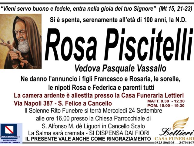 La comunità è rimasta scossa e addolorata per la perdita. La sua famiglia è ora nello sconforto e nella tristezza. Rosa Piscitelli era una donna forte, intelligente, una persona speciale, altruista e benvoluta da tutti. Una madre e nonna amorevole. Lascia i suoi figli Francesco e Rosaria, i nipoti e i parenti tutti.