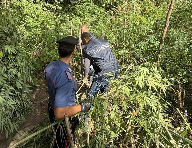 ACERRA/SAN FELICE A CANCELLO. Una serra artigianale nascosta tra la vegetazione e coltivata con settanta piante di marijuana, alte in media due metri: è quanto hanno scoperto, nella tarda mattinata di oggi, 25 settembre 2025 i Carabinieri della Stazione di Cancello, nel casertano, al termine di una mirata attività investigativa condotta nei pressi del comune di Acerra.
