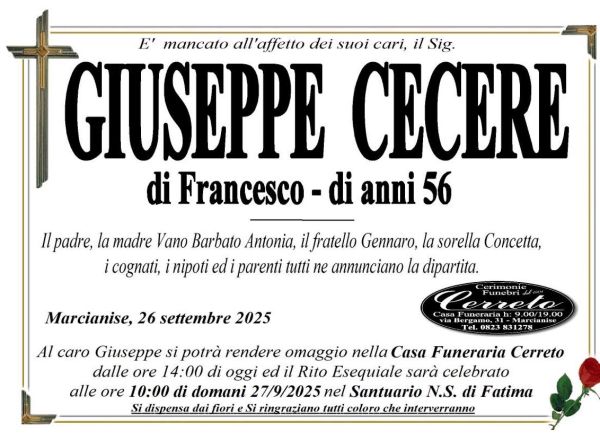 Marcianise. Grande dolore oggi a Marcianise, per la prematura scomparsa di Giuseppe Cecere. Aveva 56 anni. Purtroppo era afflitto da un brutto male. Nonostante gli sforzi dei medici e il fatto che non si sia mai arreso, alla fine non ce l’ha fatta.