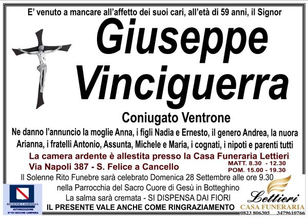 San Felice a Cancello. Grande dolore oggi a Botteghino, frazione di San Felice a Cancello, per la prematura scomparsa di Giuseppe Vinciguerra, che purtroppo si è spento all’età di 59 anni, residente in via Termine.