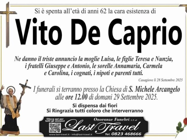 Si chiamava Vito De Caprio. La sua scomparsa ha generato grande dolore tra amici e familiari, che ora piangono la sua dipartita. Era conosciuto come una gran brava persona, gentile e buono, un padre e marito amorevole, un lavoratore onesto. La brutta notizia si è subito diffusa e la comunità è rimasta attonita dall’accaduto.