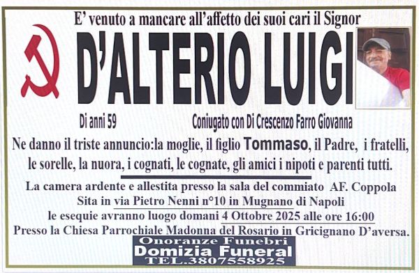 Si chiamava Luigi D’Alterio, aveva 59 anni. La sua dipartita ha gettato nel dolore e nello sconforto gli amici e i parenti. Tutti lo conoscevano come una gran brava persona, un uomo perbene, gentile ed educato, un padre e marito amorevole e devoto, appassionato di arte. lascia la moglie Giovanna e il figlio Tommaso che piangono al sua dipartita.