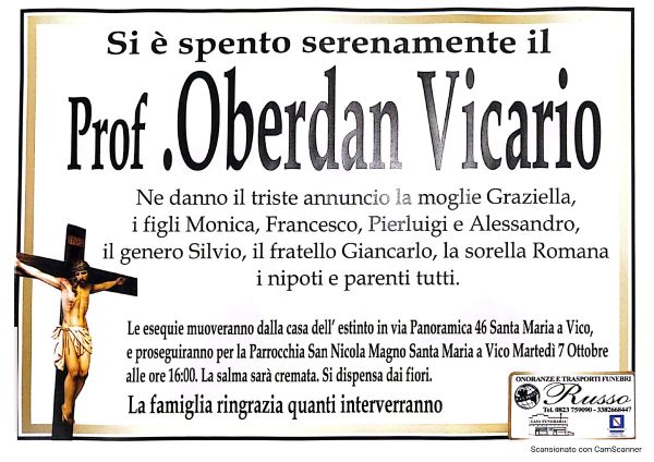 “Il Sindaco Andrea Pirozzi e l’Amministrazione Comunale di Santa Maria a Vico esprimono il più sentito cordoglio alla famiglia Vicario per la scomparsa del prof. Oberdan Vicario, già assessore comunale. Con passione autentica e profondo impegno verso l’arte presepiale, il prof. Vicario ha saputo offrire alla nostra comunità rappresentazioni artistiche di straordinaria bellezza ed emozione. Il suo instancabile impegno è stato motivo di grande orgoglio per Santa Maria a Vico, e la sua figura continuerà a rappresentare un esempio di cultura, tradizione e identità per le future generazioni. L’intera comunità si stringe con affetto e commozione intorno alla famiglia in questo momento di profondo dolore.”