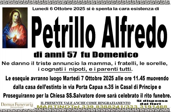 I suoi funerali saranno celebrati domani alle ore 11:45 presso la chiesa SS. Salvatore a Casal di Principe.